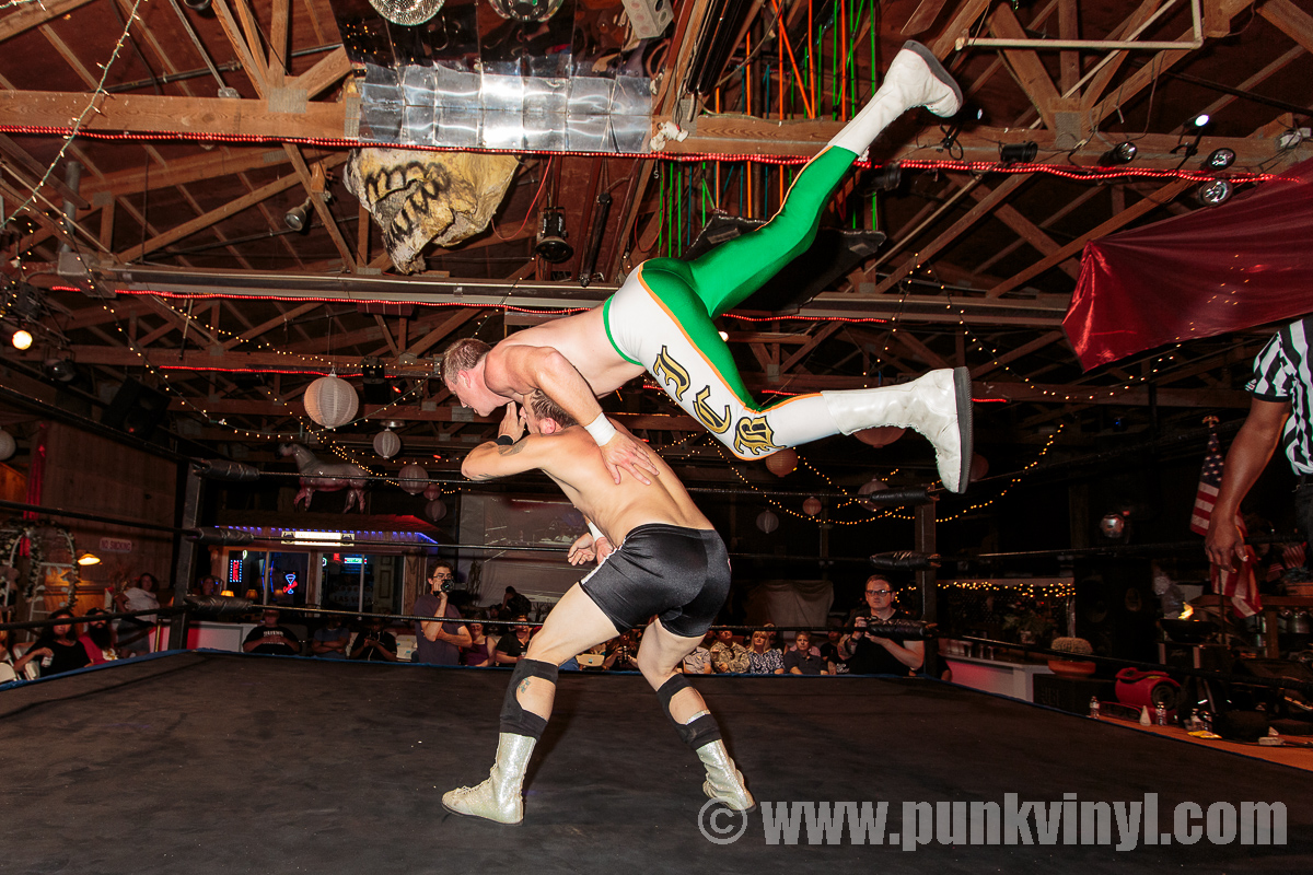 Heavyweight champion Special Dark Suge D and Tommy Else faced the team of Scotty Young and big Russ Jones in a tag match. Suge and D came out with all guns blazing but were soon picked apart by Scotty and Russ. When Tommy Else unsuccessfully tried to body slam the monster Russ, he was pounded to the mat and lost after a huge splash by the big man. Scotty and Russ hopped out of the ring and Scotty was gloating that he got the one-up on the champ.